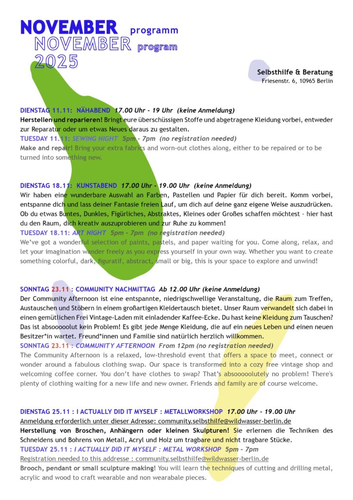 Hier findet ihr die aktuellen Angebote des Bereichs Selbsthilfe und Beratung. Wenn eine Anmeldung für den Workshop benötigt wird, meldet euch bei community.selbsthilfe@wildwasser-berlin.de.