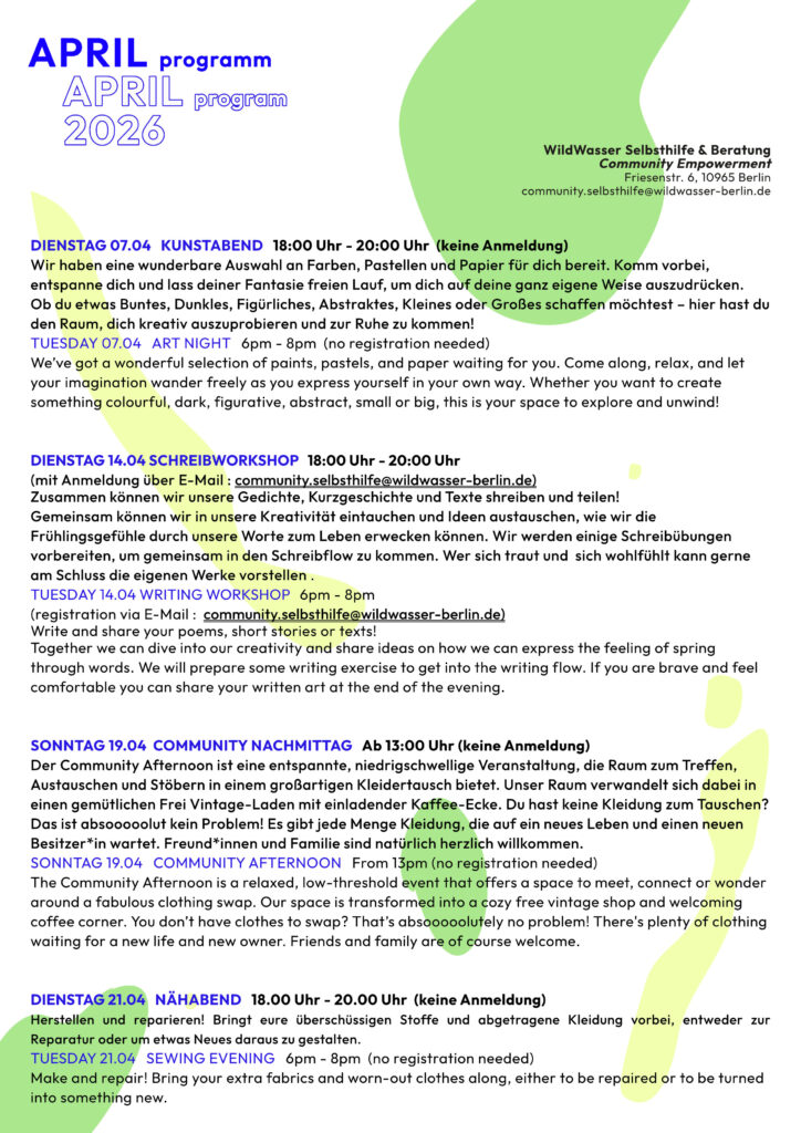 Hier findet ihr die aktuellen Angebote des Bereichs Selbsthilfe und Beratung. Wenn eine Anmeldung für den Workshop benötigt wird, meldet euch bei community.selbsthilfe@wildwasser-berlin.de.